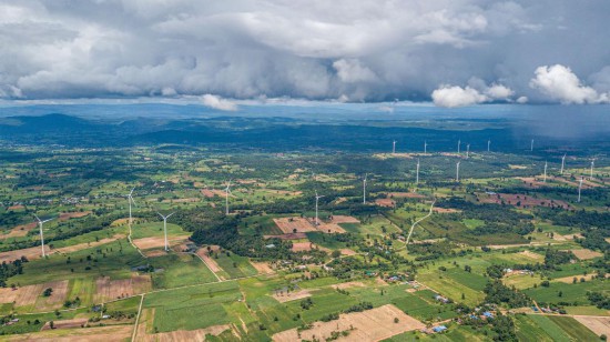 这是2023年10月5日在泰国猜也蓬府拍摄的由中国金风科技提供的风力发电机(无人机照片)。新华社记者王腾摄