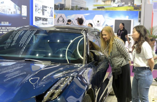 4月15日,采购商在第135届广交会上参观新能源汽车。新华社记者卢汉欣摄