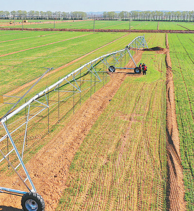 山东省济南市平阴县孝直镇的高标准农田种植基地里,当地供电部门员工排查消除农田配套电力设施安全隐患,保障春灌用电。